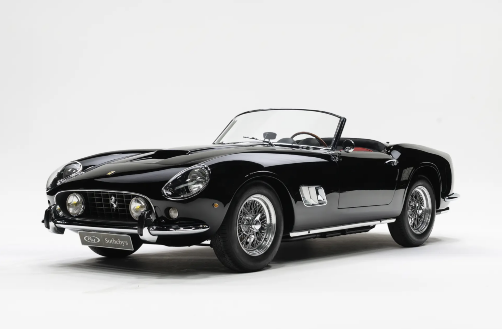 Juste derrière dans le catalogue : une Ferrari 250 GT California Spider SWB de 1960, châssis 1915GT, troisième exemplaire des 56 châssis courts produits. Et pas n’importe lequel : c’est l’un des 39 configurés d’origine avec phares escamotables.