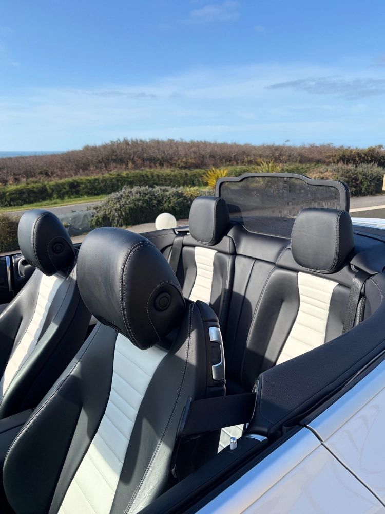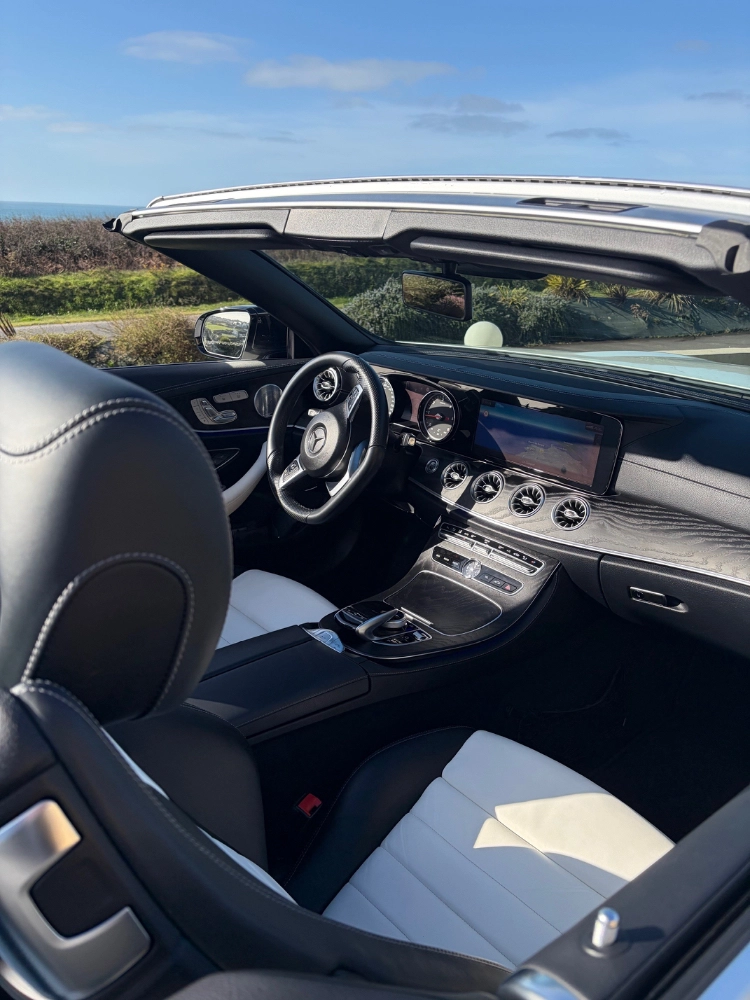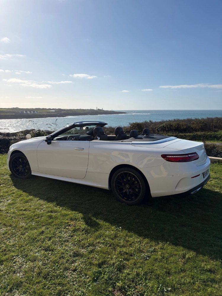 Mercedes cabriolet de 2018, une version Classe E qui permet de voyager à 4 personnes dans un excellent confort, sièges cuirs bi-colores, très élégants, véhicule très peu kilométré et dans un parfait état. Vous passez en cabriolet en 20 secondes tout en roulant, jusqu'à 40 km/h. Dans sa catégorie c'est le plus complet de part son équipement et son confort de conduite. Location à la journée ou 2 à 3 jours, avec différentes propositions d'options, équipement pour PIC NIC, suggestions de circuits, restaurant et crêperie pour des moments gourmands ou idées d'hôtellerie insolite pour renforcer votre voyage iodé en plein air !