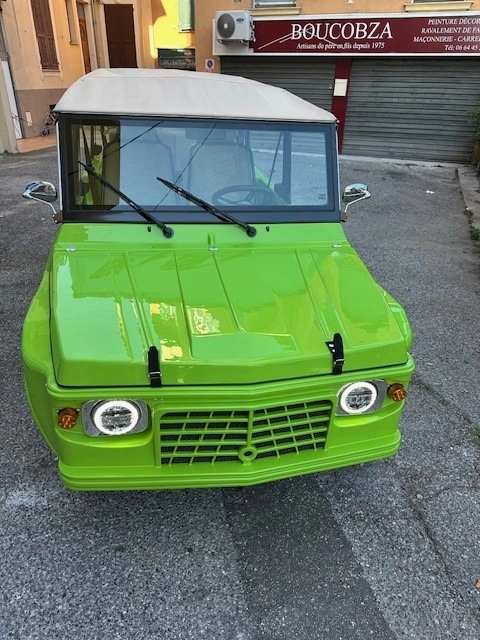 Modèle : Citroën Méhari électrique (2024) Motorisation : 100 % électrique Puissance : équivalente à 20 ch Autonomie : environ 120 km Vitesse maximale : 80 km/h (limitée) Transmission : automatique, simple et intuitive Places assises : 4 Couleur : Vert Tibesti “L’Évasion”