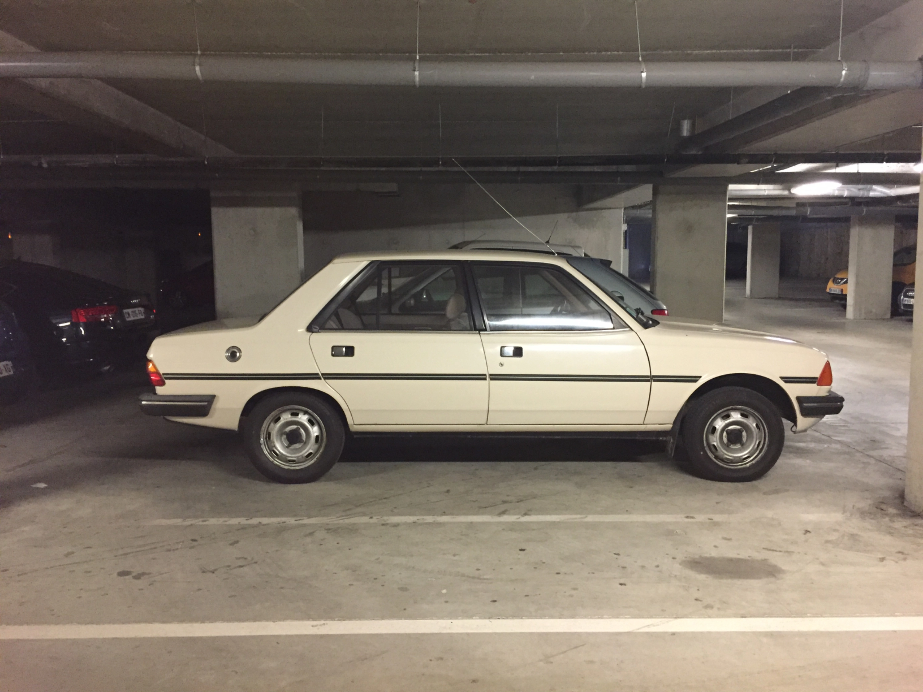 Héritage des années 80, cette Peugeot 305 dans un état de conservation exceptionnel vous plongera dans l’époque de vos parents, grands-parents, ou même de votre enfance. Les sièges moelleux en tissus, confortables été comme hiver et la sobriété du véhicule soulignent l’austère élégance de ce modèle classique. Équilibre entre la rudesse d’une ancienne et la praticité des véhicules modernes, la 305 se manoeuvre aisément en ville, son gabarit contenu y aide. Son charme réside dans ce caractère doucement désuet, en toute modestie, réhaussé par sa teinte beige crème et ses pare-soleils assortis.
